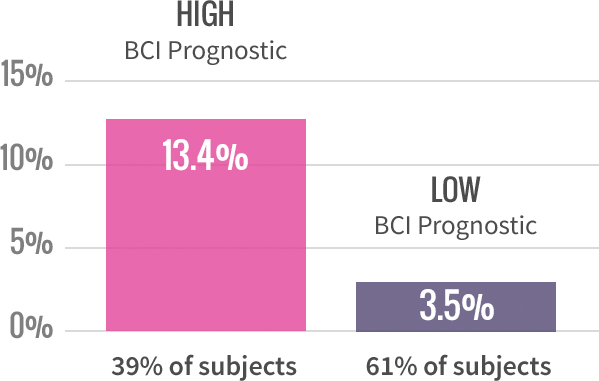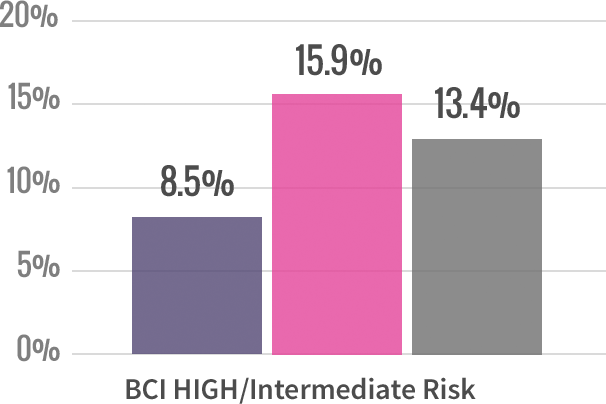 BCI patients identified as BCI LOW risk had 2.5 – 3.5% risk of late recurrence across validation studies