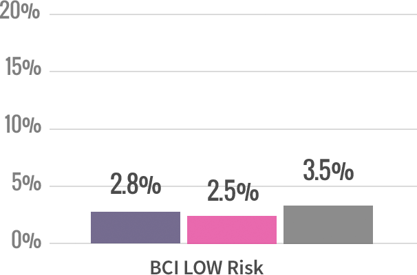 BCI patients identified as BCI LOW risk had 2.5 – 3.5% risk of late recurrence across validation studies
